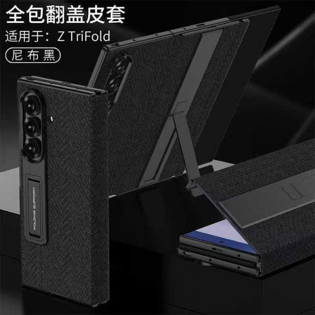 Protect your Samsung Galaxy Z TriFold in style with this premium full-cover flip case. Crafted with a high-quality fabric-texture leather exterior, it offers a sophisticated look while providing strong protection against drops, scratches, and daily impacts. The case features a built-in adjustable kickstand, allowing you to enjoy videos, video calls, and reading in a comfortable hands-free position. Precise cutouts ensure easy access to all ports and buttons, while reinforced edges and camera protection keep your device safe from every angle. A perfect combination of durability, elegance, and functionality for your Z TriFold.