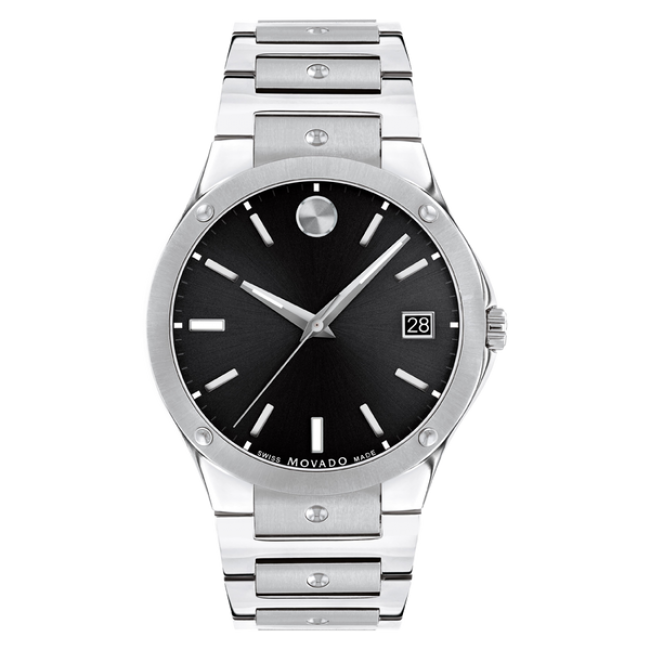 Movado Series 800, 40 mm Performance Steel case and bracelet with black-toned dial.
