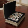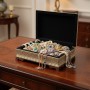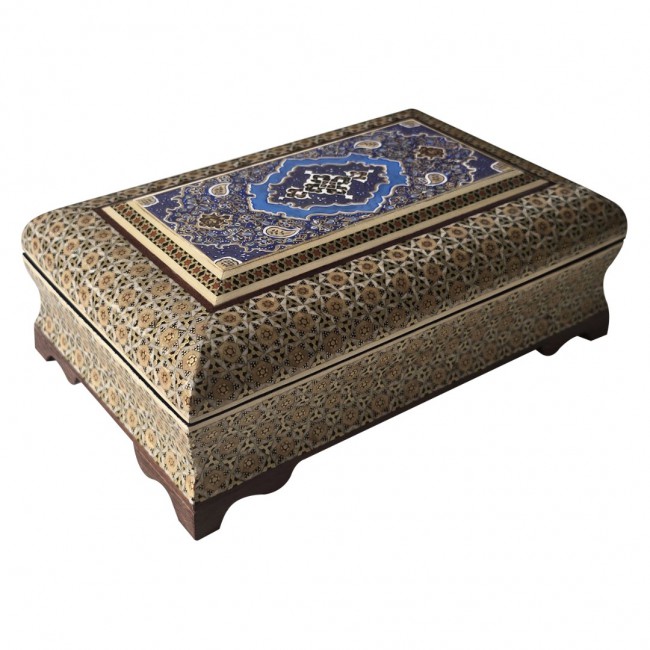 Discover the exquisite artistry of Persian craftsmanship with this MARGOUN Khatamkari jewellery box. Meticulously handcrafted using the ancient Middle Eastern art of marquetry, this octagonal box showcases intricate inlay work that transforms it into both a practical storage solution and a stunning decorative piece. Measuring 22*14*7.5 centimetres, this keepsake box provides ample space for your precious jewellery and trinkets while serving as an eye-catching accent piece. The traditional Khatamkari technique involves precisely arranging tiny pieces of wood, bone, and metal in sophisticated geometric patterns, creating a mesmerising visual effect that exemplifies Persian artistic heritage. Each box is uniquely handcrafted, making it not just a storage container, but also a collectible piece of authentic Middle Eastern artistry that adds cultural sophistication to any room's décor.