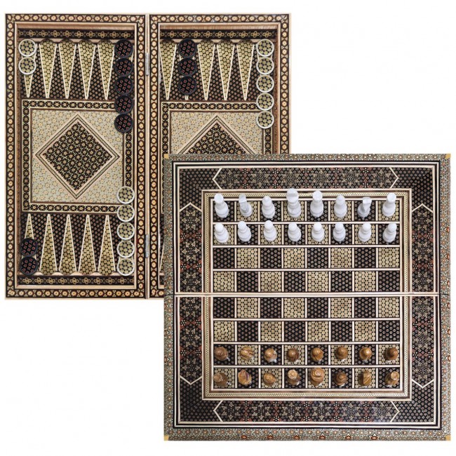 The set includes a game board( chess and backgammon), a chess cover, and khatam backgammon beads.