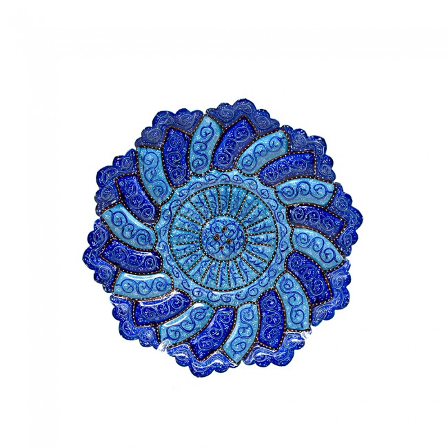 Minakari or Enameling is the art of painting, coloring and ornamenting the surface of metals. The art of Minakari is called miniature of fire as well as the decoration of metal and tile with mina glaze. Lobed rim enamelware with its light cyan, aqua and pale turquoise colors can take you from the middle of modern and colorless industrial world with skillful hands of an enameller (minakar) to the middle of sky and its fantastic drawings lead a memorable tranquility.