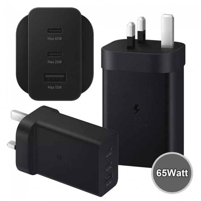 The Samsung 65 W Power Adapter Trio (model EP-T6530N) is a powerful, compact wall charger that allows you to charge up to three devices at once. It comes with two USB-C ports and one USB-A port, making it flexible enough to power modern high-wattage devices (like laptops) as well as older or smaller gadgets (like phones, tablets, or earbuds).