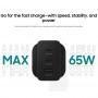 It supports fast charging protocols including USB Power Delivery (PD) 3.0 and Samsung’s Super Fast Charging (SFC) 2.0, delivering up to 65 W when just one device is connected. The design is practical and user-friendly, with protection against overheating, overcurrent, and short circuits. The charger is compact (just ~52 × 30 × 108 mm) and weighs around 155 g.